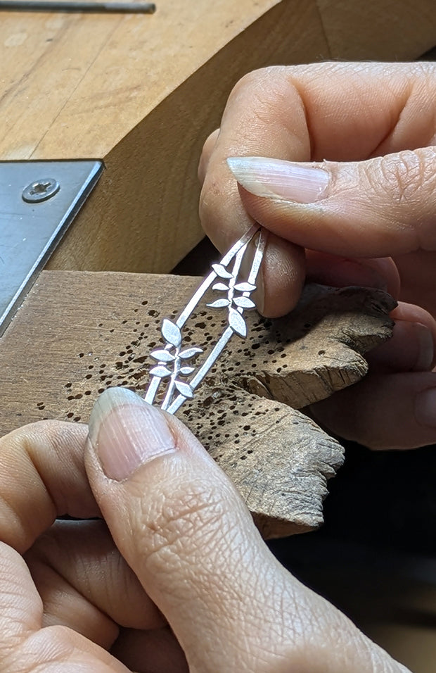 Je travaille de manière totalement artisanale, de A à Z. Du premier croquis sur papier à la dernière touche de polissage, chaque étape de la fabrication est réalisée à la main. La création artisanale c’est prendre le temps, avec patience et amour, de créer quelque chose d’unique. J’utilise des matériaux nobles comme l’argent, l’or et des pierres précieuses ou semi-précieuses.