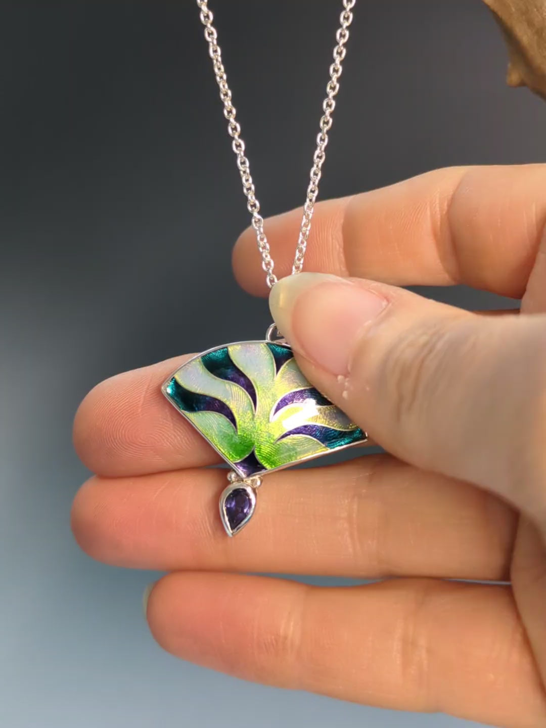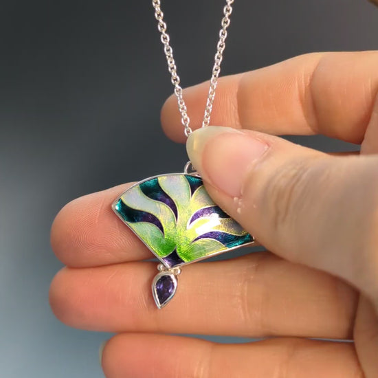 Pendentif éventail opalescent en argent, émail et Iolite